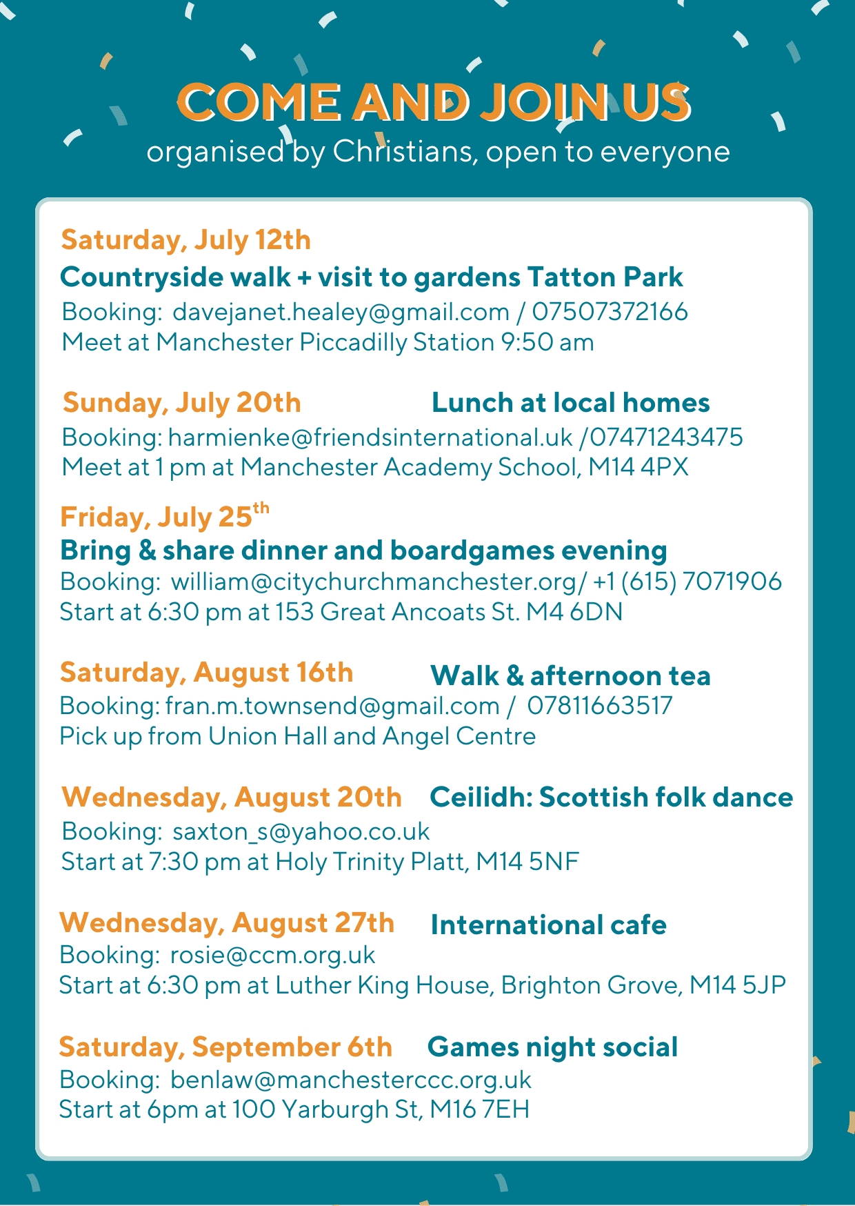 Visit our Events page above to see further examples of some of the activities we offer and things you can do while in Manchester!