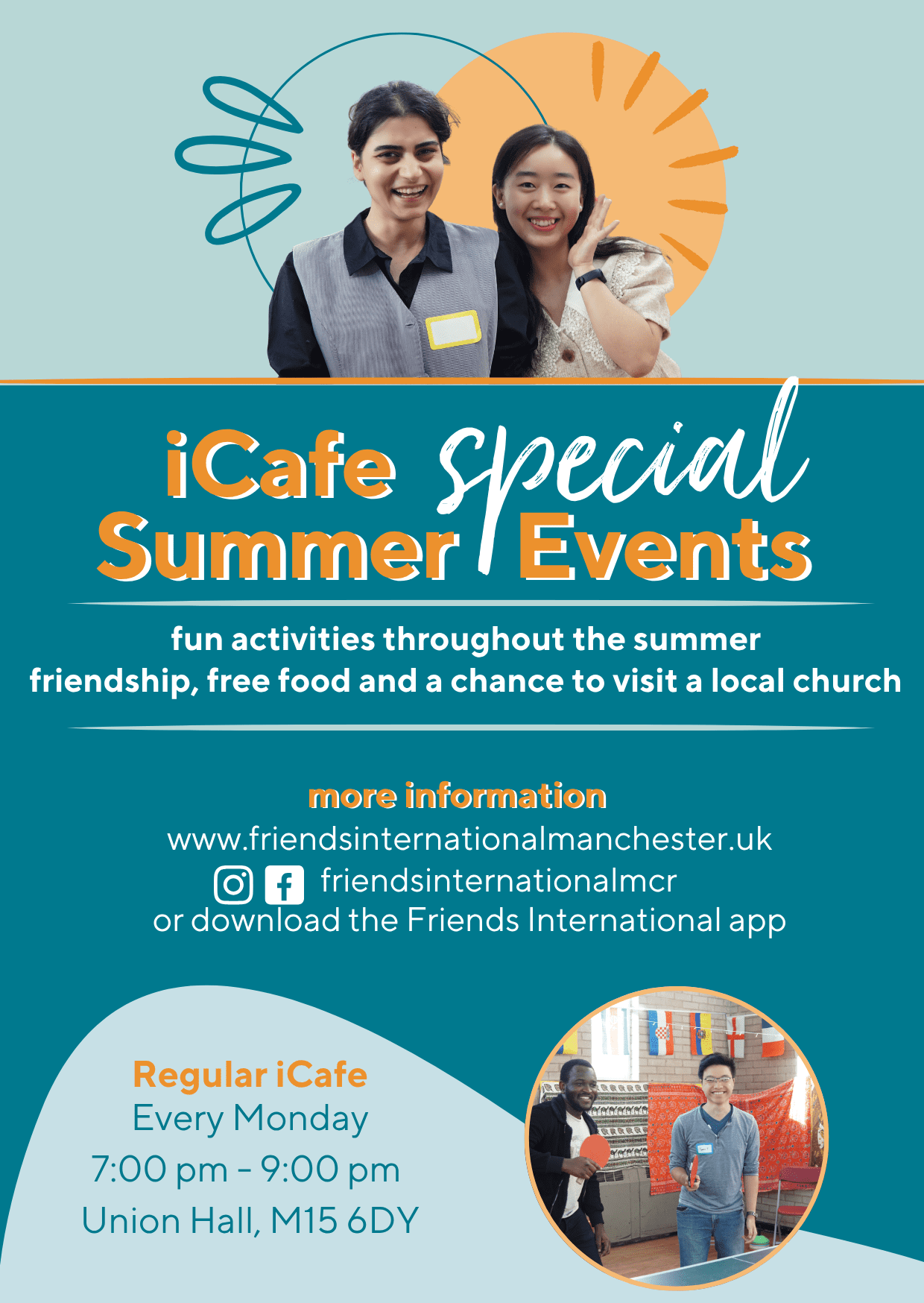 One of the main ways to connect is to come to one of our free iCafés to meet new friends, practise your English, play games, or discuss important questions about life. Our two options are shown below: